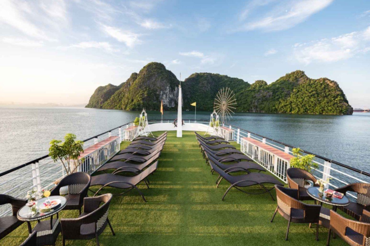 Embark on a luxurious cruise tour in Ha Long Bay, where opulence meets natural beauty. Indulge in lavish amenities, exquisite dining experiences, and unparalleled service as you sail through the stunning karst formations and turquoise waters of this UNESCO World Heritage Site. Unwind in elegant cabins, relax on spacious decks, and immerse yourself in the enchanting landscapes of Ha Long Bay in the lap of luxury, creating unforgettable memories that will last a lifetime.